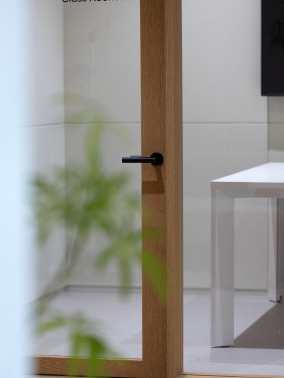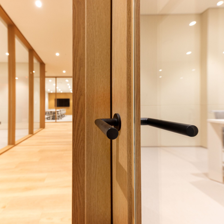 Along the corridors, repetition becomes a defining element, where frames, glass and hardware align into a continuous architectural rhythm.